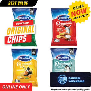Get your hands on Bluebird's 150g (by flavor) chips, exclusively at Taufusi! Perfect for snacking on-the-go or enjoying with friends, these chips are a must-have. Don't miss out and pick them up at Bargain Wholesale today!