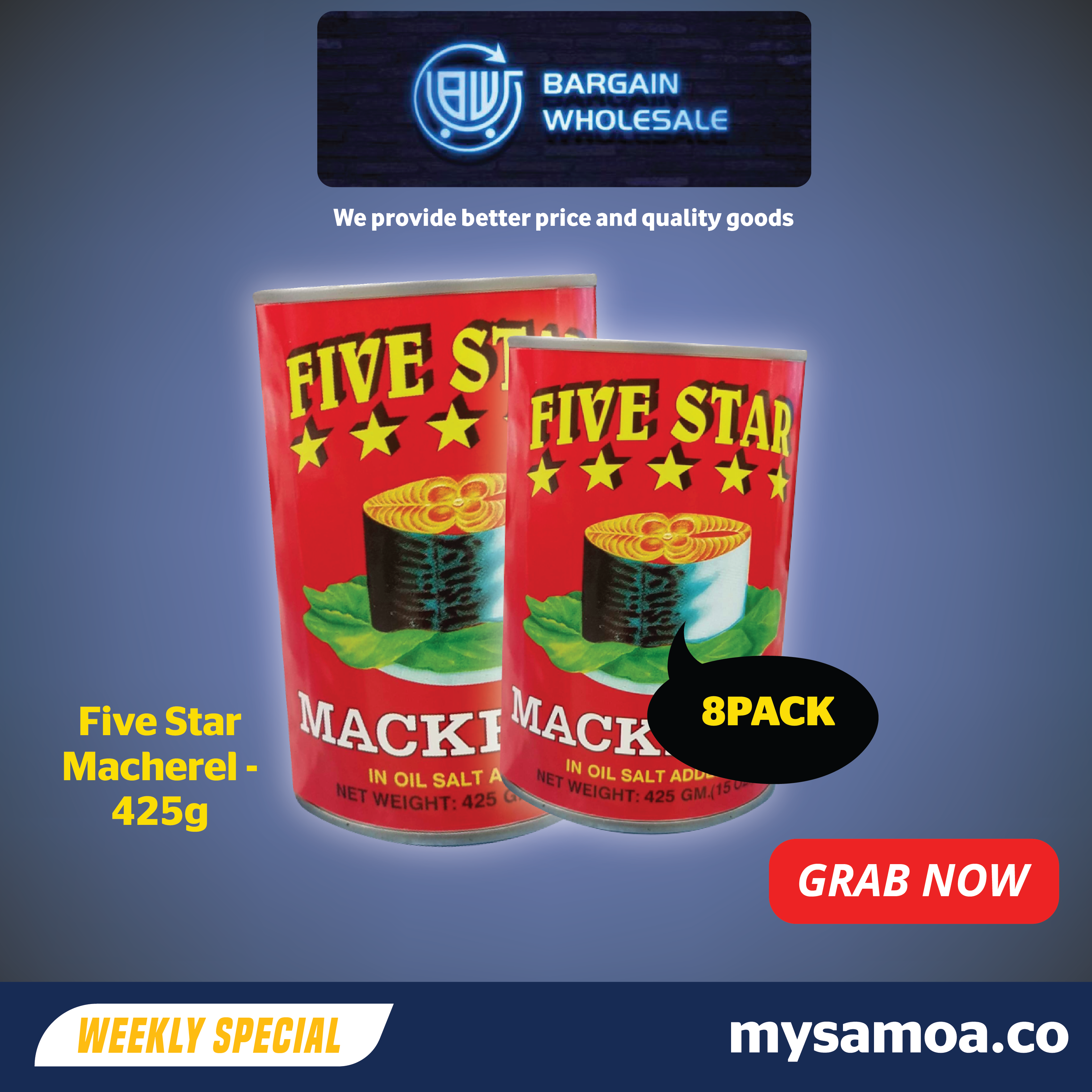 Indulge in the rich, savory taste of Five Star Macherel - 425g x 8 Pack, exclusively available at Taufusi. With each pack providing 425g of high quality fish, this delicious and convenient option is perfect for stocking up your pantry. Don't miss out - pickup yours today at Bargain Wholesale!