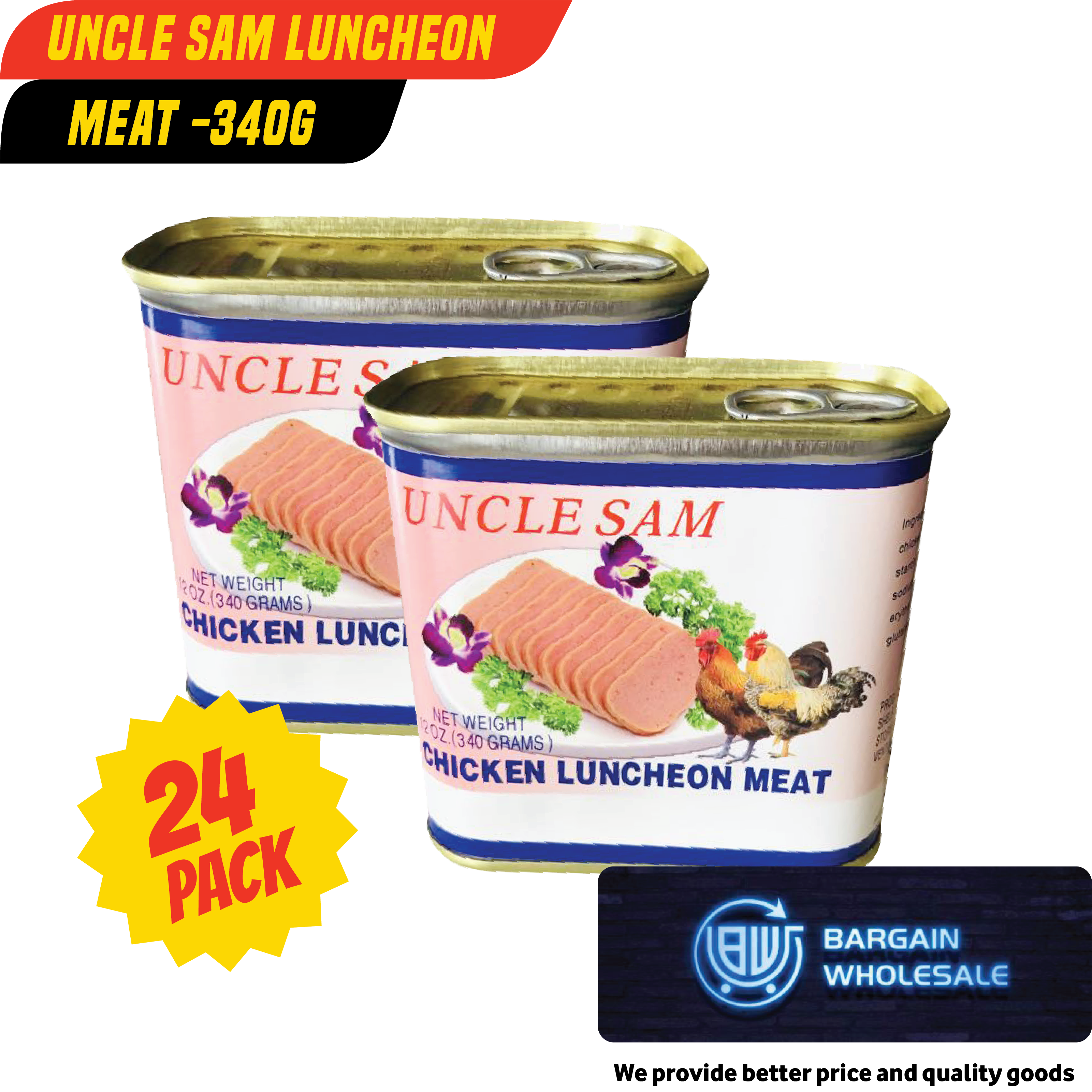 Enjoy the delicious and savory taste of Uncle Sam Luncheon Meat. Made with quality ingredients, this 24 pack will provide you with a convenient and filling meal option. Perfect for a quick lunch or snack, available exclusively at Taufusi and easy to pick up at Bargain Wholesale.